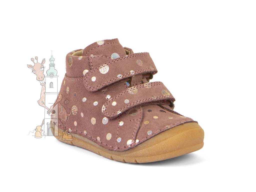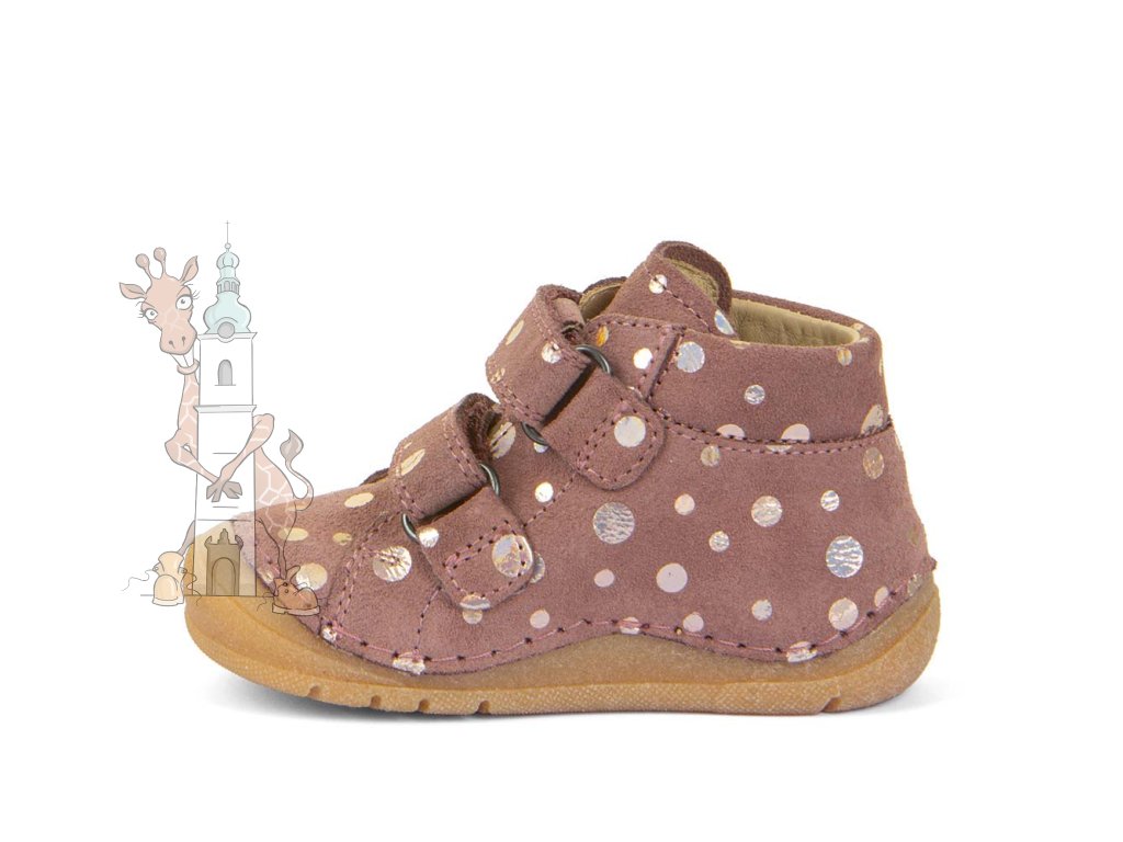 - svrchní materiál - broušená kůže s blýskavými růžovo-zlatými tečkami, vhodná údržba impregnací Sigal Aquastop https://www.detska-obuv.cz/impregnace-sigal-aquastop